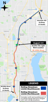 Seattle City Light crews will be relocating an overhead transmission line on Interstate 5 at Northeast 195th Street in Shoreline as part of Sound Transit’s Lynnwood Link Extension project. The work will result in nightly traffic impacts on Aug. 3-4. Washington State Patrol troopers and construction crews must intermittently conduct rolling slowdowns of traffic in…