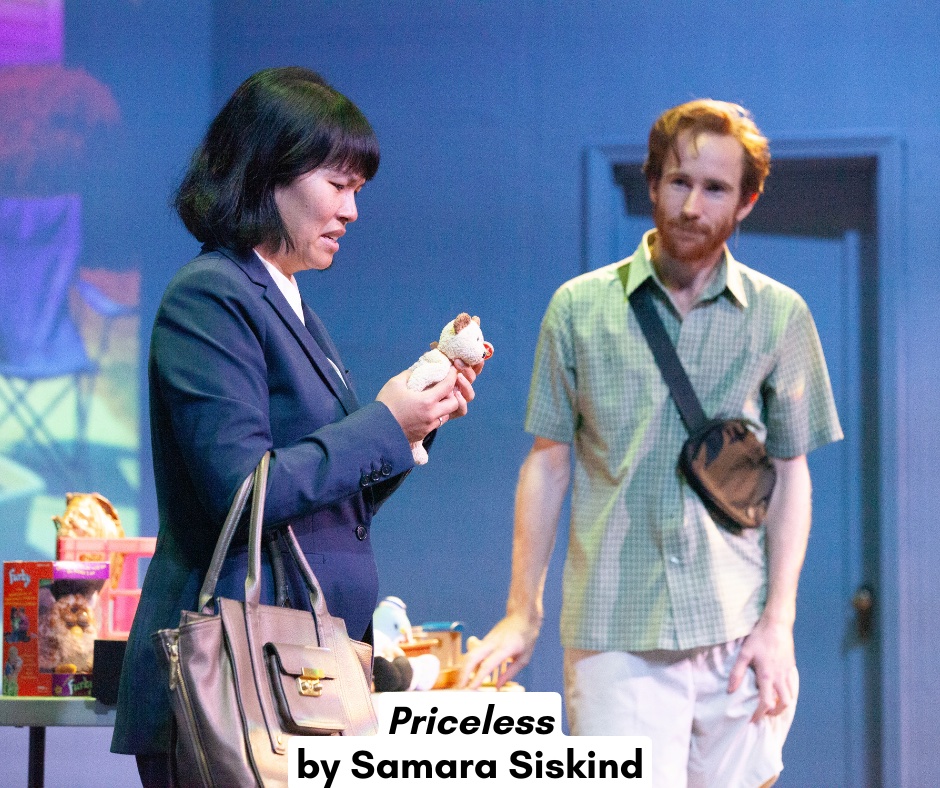 In Priceless, two strangers — over a table of bric-a-brac — stumble into each other’s history. Cindy Chen brings genuine vulnerability as Samantha, and James Andrew Carroll’s Jonas is unexpectedly tender. What begins as a tense barter over a small stuffed toy becomes a sweet portrait of shared pasts. Their chemistry is gentle, believable. A truly lovely, soft moment of connection.