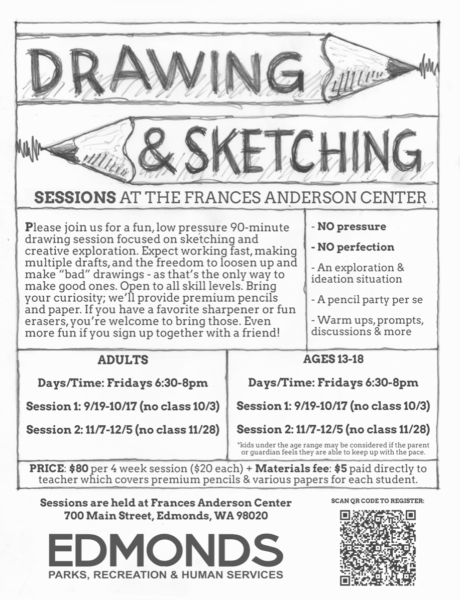 Join other artists for a fun, low-pressure 90-minute drawing session focused on sketching and creative exploration. The sessions begin with quick warm-ups, move through a series of guided prompts and wrap with a free sketch period where you can refine ideas or go wherever your pencil takes you. A short group recap will share insights and favorite moments.