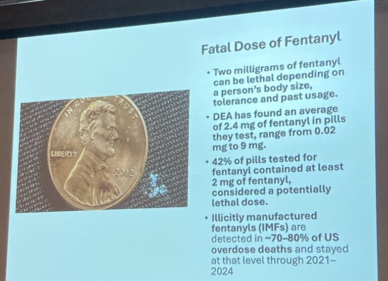Fentanyl is 100 times stronger than morphine and 50 times stronger than heroin, Juergens said. He pointed out that In 2023, there were about 73,000 opioid-related deaths in the U.S. with most attributed to fentanyl. By 2024 this number had dropped slightly, to about 50,000.