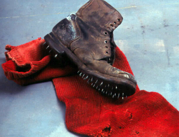 The one item that the loggers had multiple pairs of was socks. Loggers wore ankle-covering shoes with metal or wooden spikes in their soles to help them keep their footing on wet, slippery trees or logs. Inside the shoes loggers wore thick woolen socks that were soaked by sweat or the weather by the end of the day. Before being worn again, they had to be dried out in the bunkhouse without being washed. The loggers also had to mend holes they had worn in the socks to protect their feet. One can only imagine the odor that came from 40 pairs of wet socks plus other wet clothing as it hung in the bunkhouse being dried by the heat from the wood-burning stove.