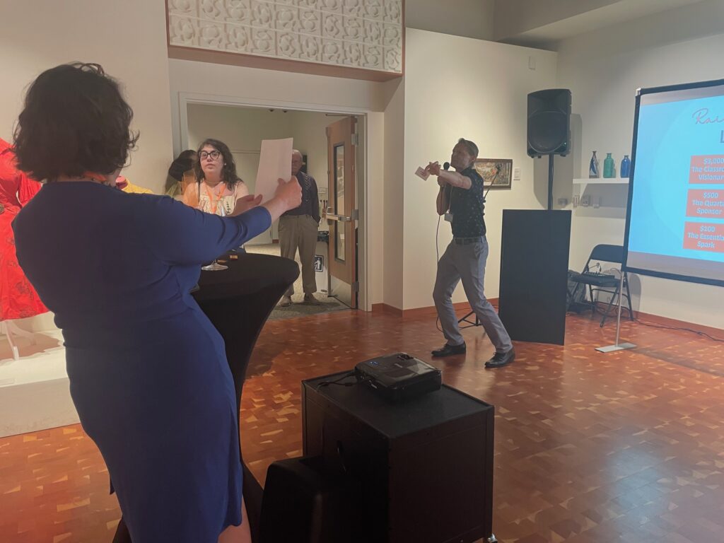 Before beginning the live auction, Scott McKinstry, a Driftwood Players actor and Edmonds Heights K-12 parent, took a heartfelt moment to reflect on how the arts had shaped his own life. He shared the story of his father, a longtime graphic design director whose career spanned several Northwest newspapers and culminated with a prestigious award at The Oregonian. But that career, he explained, began in a high school art class.